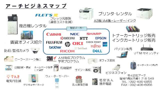 株式会社アーチは、OA機器の販売・レンタルや様々な業種の方々、特に医療関係者の開業支援などに携わっております。事務所(院内)のインフラ整備だけでなく、取扱い品目は多岐に亘ります。